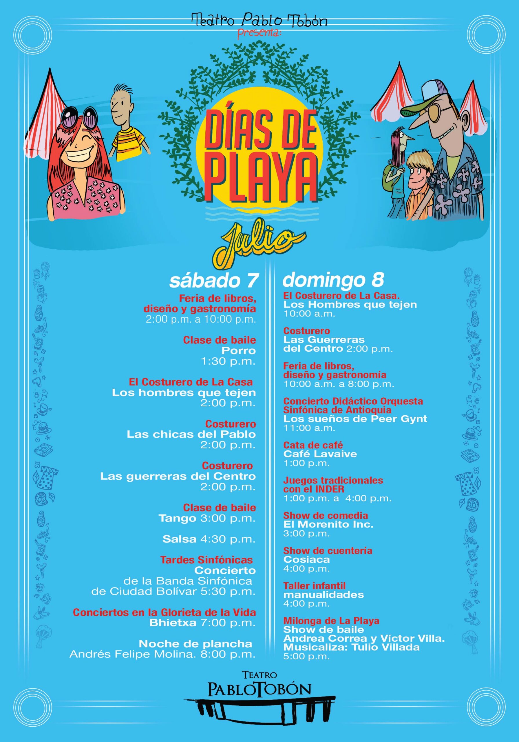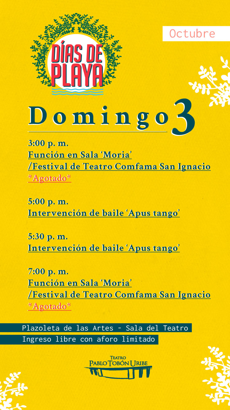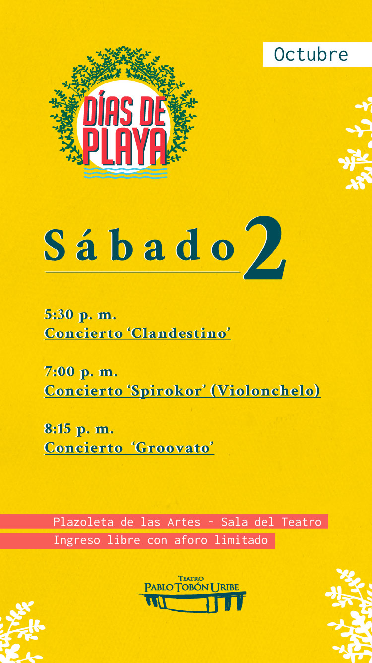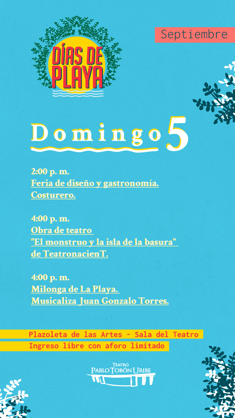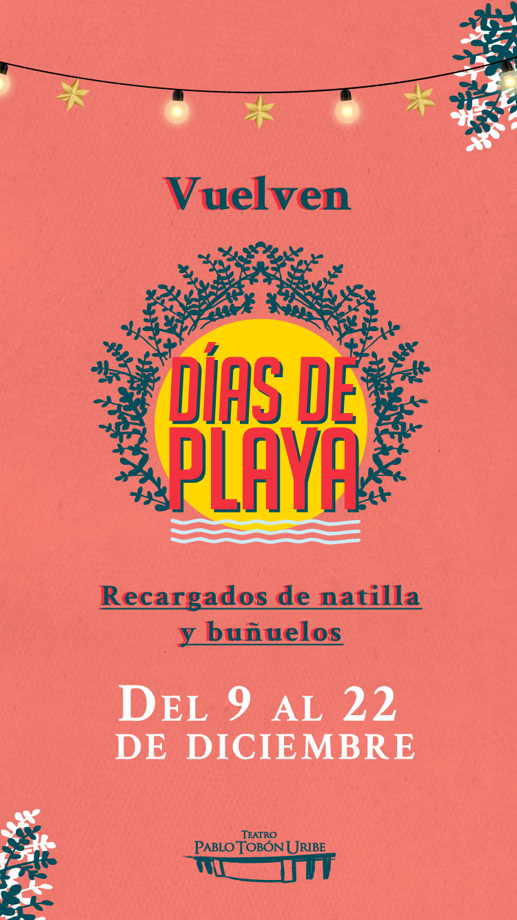 En los Días de Playa el Teatro Pablo Tobón Uribe le ofrece a la ciudad conciertos gratuitos en el espacio público, clases de baile, feria gastronómica y artesanal, conciertos en la sala, talleres de manualidades, juegos tradicionales y mucha más programación. Habitamos el espacio público desde la cultura.