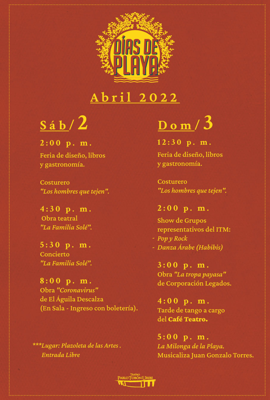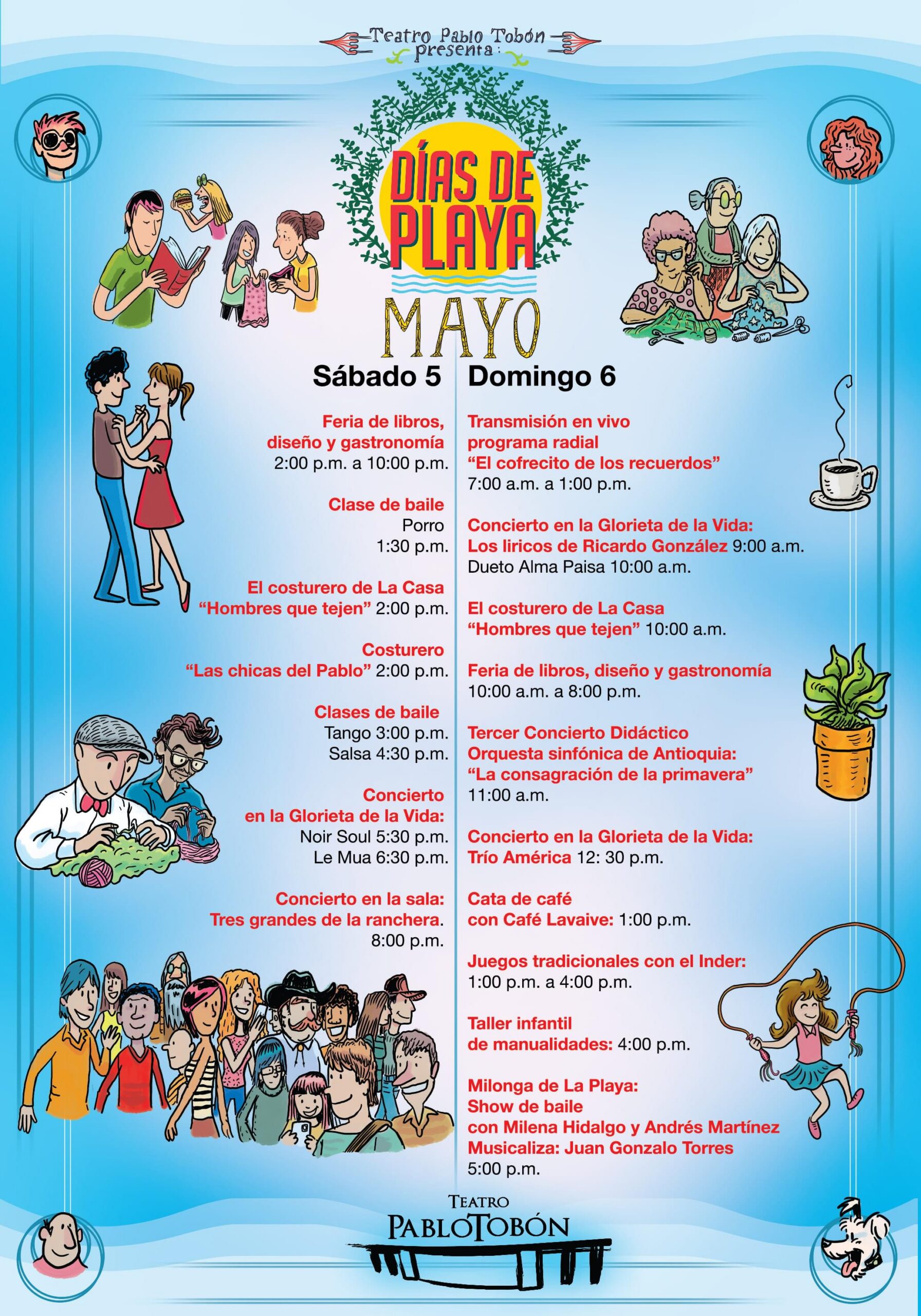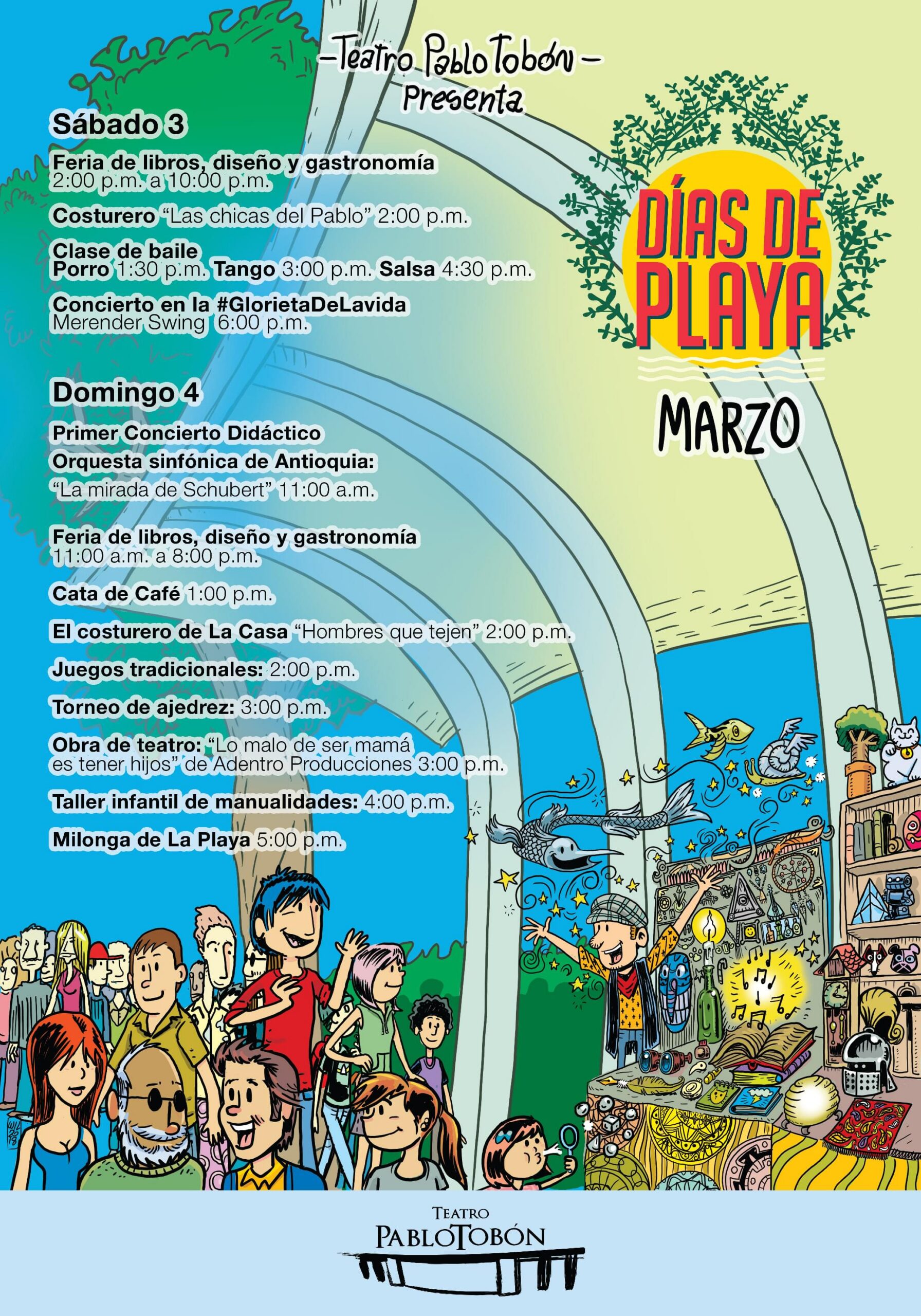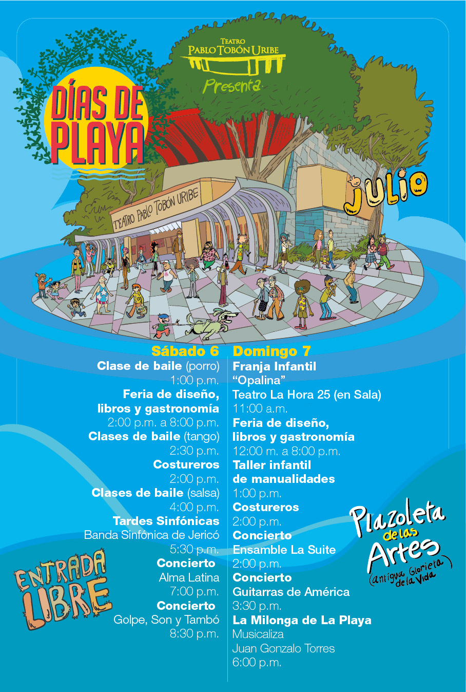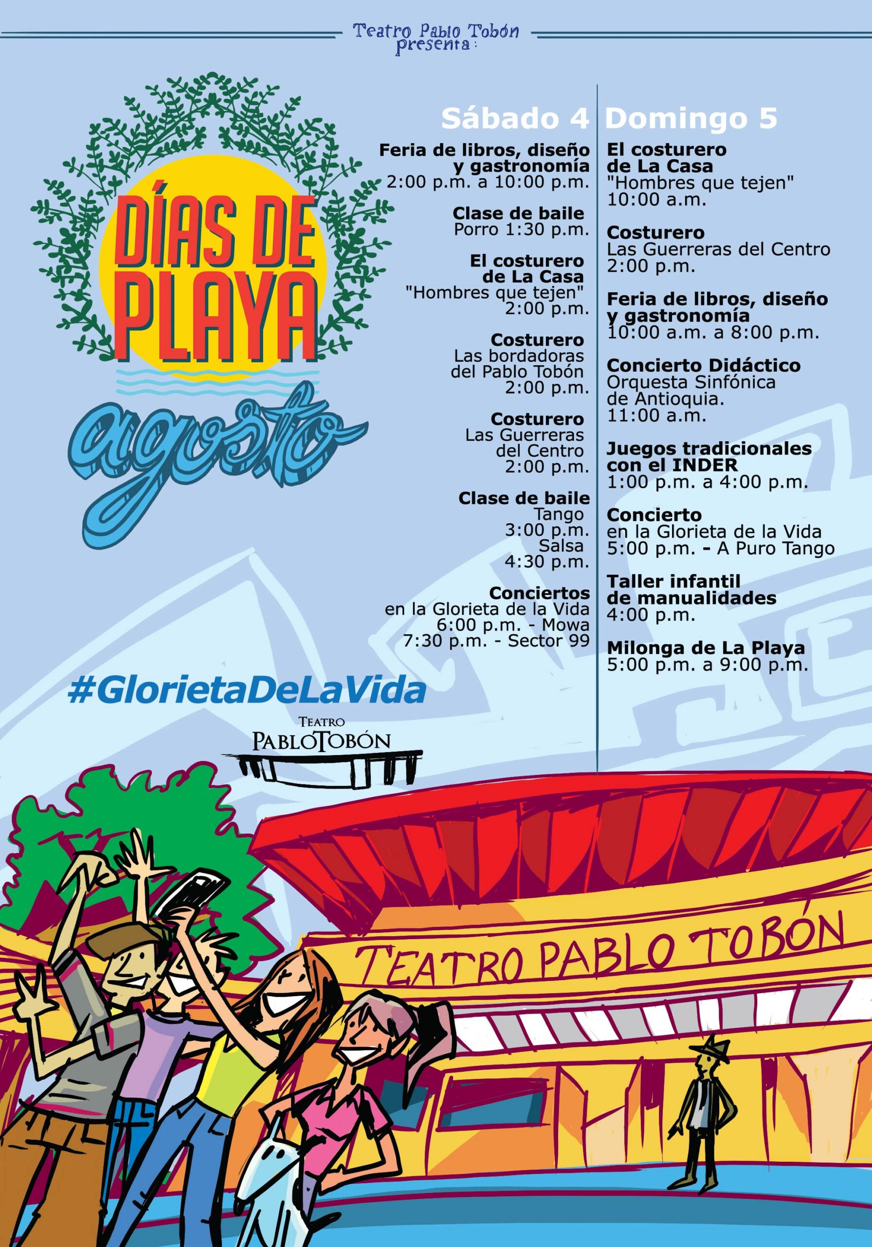 En los Días de Playa el Teatro Pablo Tobón Uribe le ofrece a la ciudad conciertos gratuitos en el espacio público, clases de baile, feria gastronómica y artesanal, conciertos en la sala, talleres de manualidades, juegos tradicionales y mucha más programación. Habitamos el espacio público desde la cultura.