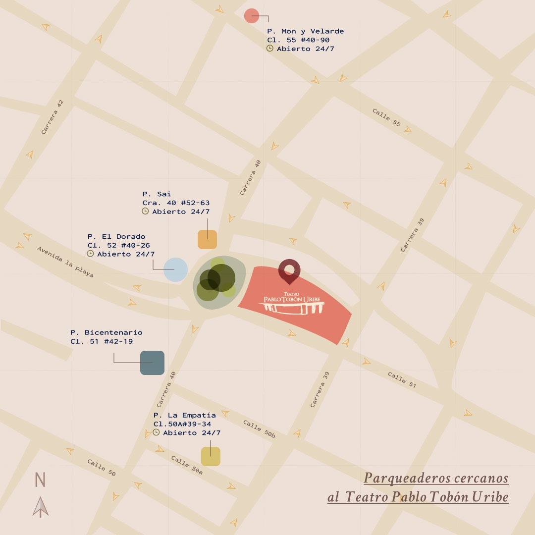 • directions_bike Pedalea hasta el Teatro por la ciclorruta de la Avenida La Playa, que se conecta con las avenidas Palacé y San Juan. Si usas EnCicla, la estación más cercana está en la Calle 51 con Carrera 40. Consulta los horarios del sistema en su sitio web encicla.metropol.gov.co y en sus redes sociales.